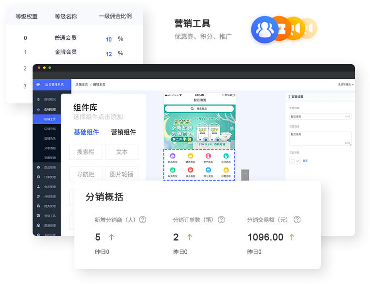 多種分銷條件設置、分銷傭金靈活設置、層級等級組合多種模式